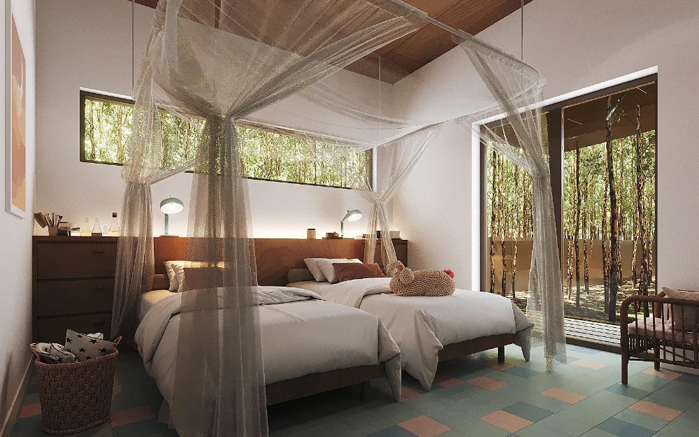 The main wall of the east facade is made by local earth sourced locally. It brings inertia to the house and makes it unique with a frugal approach (low carbon footprint + geo-sourced materials). In terms of Interiors, the design is voluntarily minimalist (to limit maintenance and make operation easy), custom-made cement tiles, loose furniture in solid wood, plywood false ceiling bring both Vietnamese touch and coziness of the Villa. Lighting designed by Kobi Studio will be contrasted to preserve the darkness of the sky (and respect the rhythm of nature around) and only focus the light where it is necessary (reading corner, dining and kitchen areas, bathroom and bedrooms).